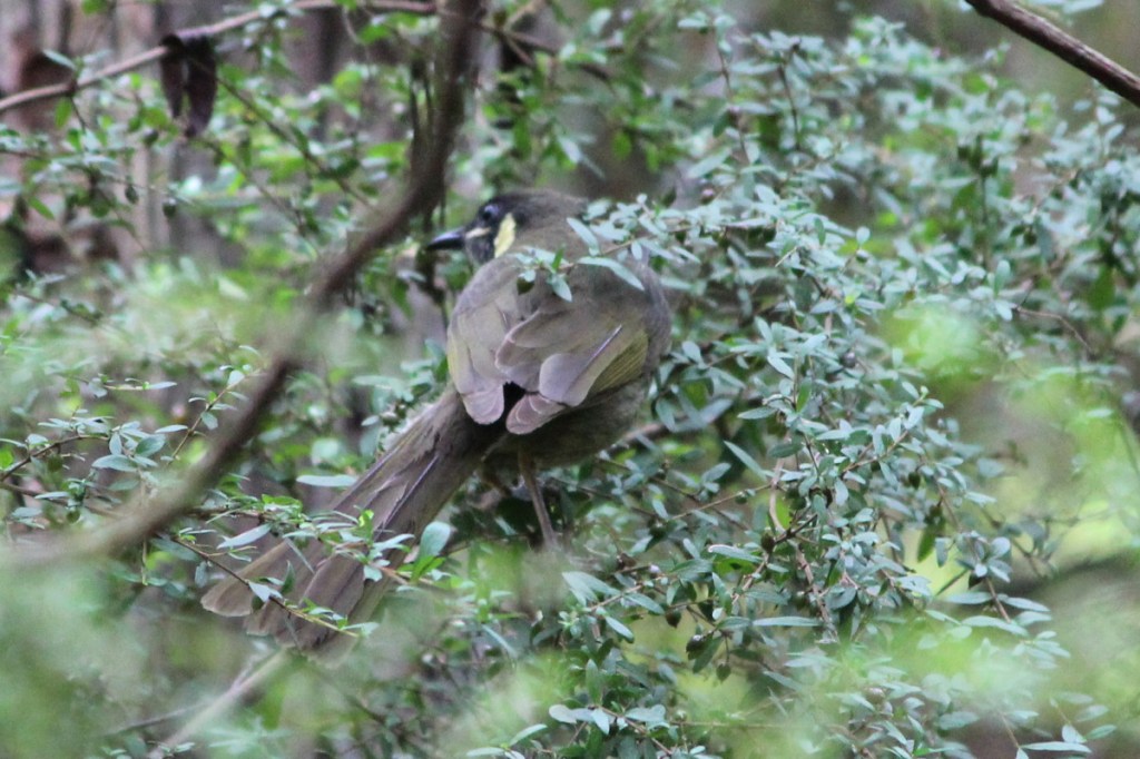 There is really no other bird that looks just like them in Mallacoota. The dark olive colour and yellow crescent on the cheek are super distinctive. Eastern Whipbird has that same dark olive colouring when seen in good light, but they look much darker (adults have a black head & bright white cheek), and even juveniles have a little crest. They are most often near the ground too.