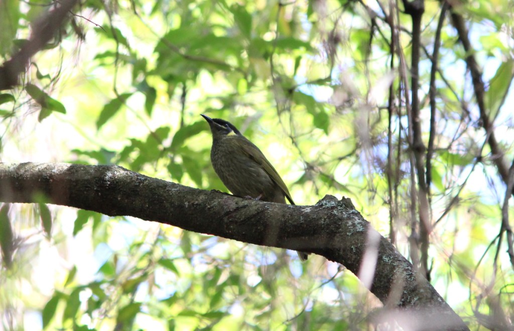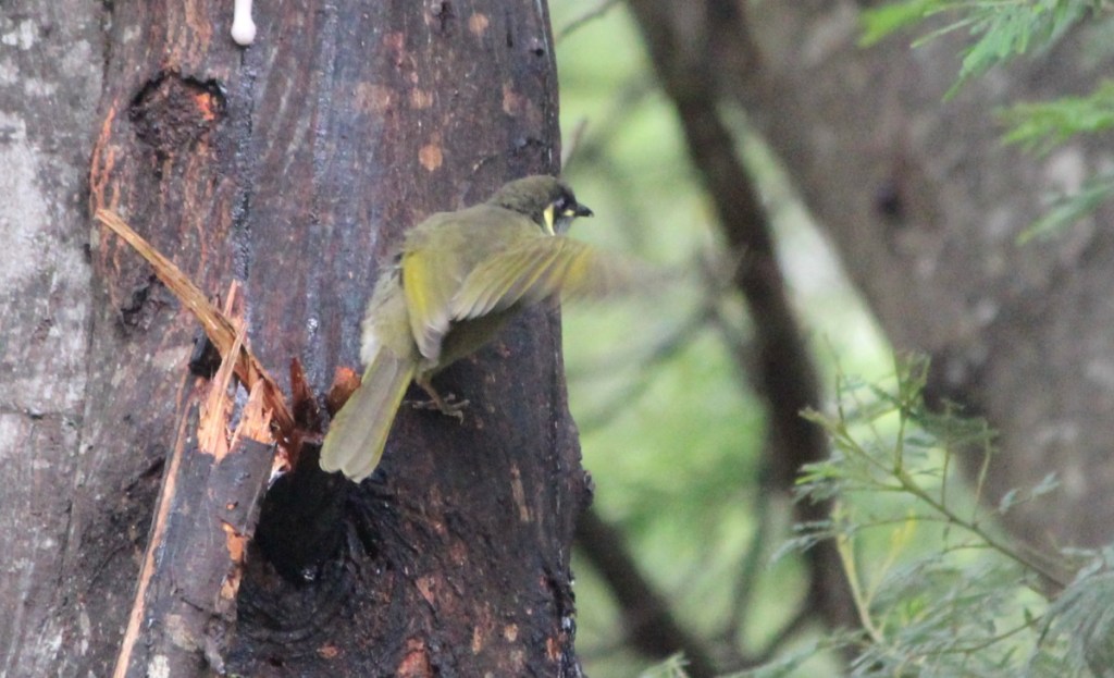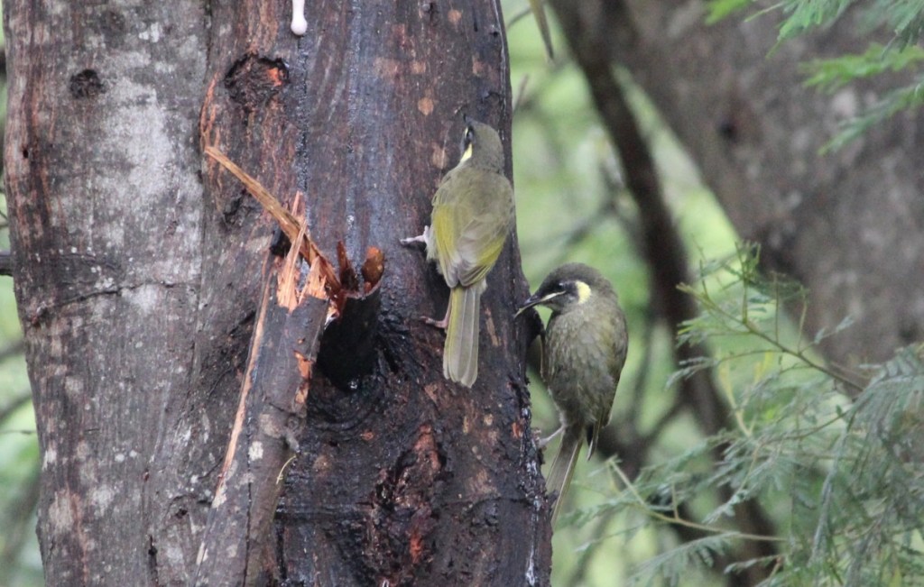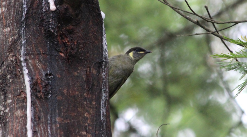 They are more often heard than seen, though, as their dark olive green, grey and yellow plumage blends into the shadows in the damp forests they love. They eat fruits, insects and nectar, and I have seen them licking sap from a wattle. We’d love to hear from you what you’ve seen them eating.