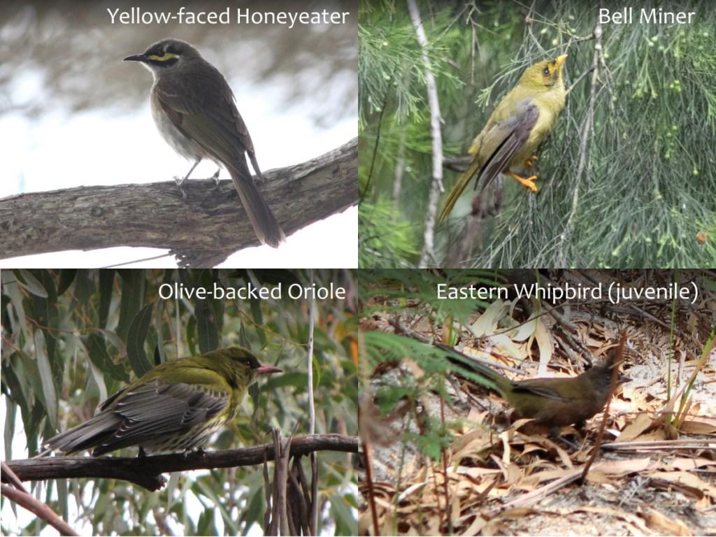 Yellow-faced Honeyeater is lighter overall, and the yellow goes from their bill, below the eye and past the cheek. Bell Miners live in similar forests, but have a stubby orange beak and orange legs. Olive-backed Oriole juvenile is bigger, lighter and has a white belly with black streaks. No other bird has that yellow crescent on the cheek.
