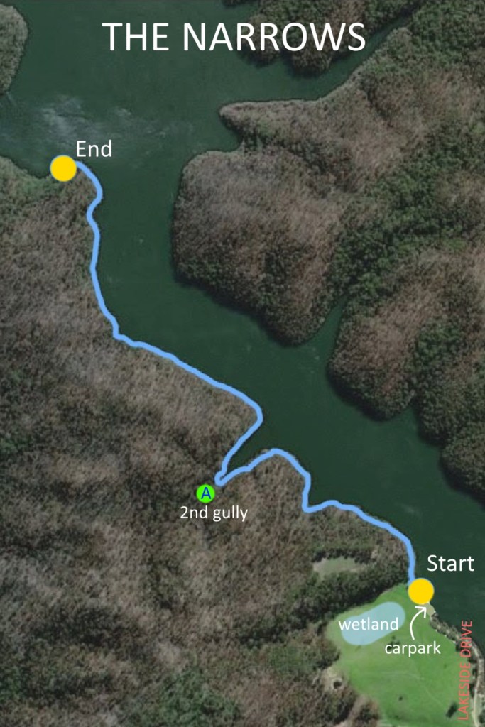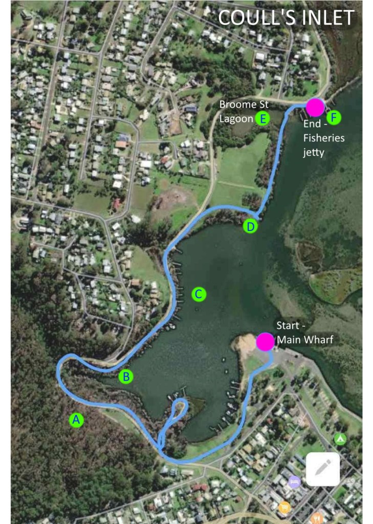eBird Hotspot: Coulls Inlet https://ebird.org/hotspot/L3498172 can be used to record the whole walk. Some people record birds seen on the Broome St Lagoon (point E) as a separate list: Inlet and Gully off Lakeside Dr at Broome St, Mallacoota https://ebird.org/hotspot/L7057573