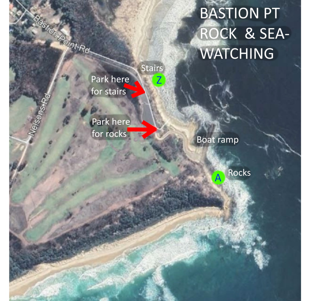 Drive all the way along Bastion Pt Rd to the carpark at the end. At low tide it is easy to check the rocks by walking down the stairs to point Z. There is very limited parking near the boat ramp: park at the top and use the stairs/ramp.