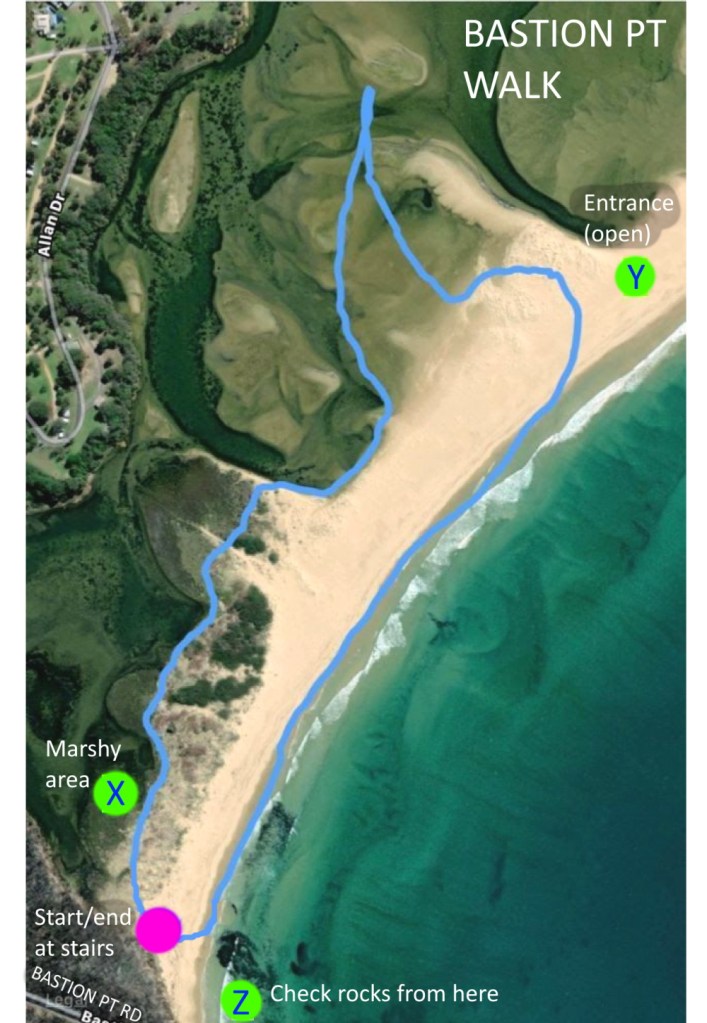 Accessibility: Stairs down to beach and beach walking thereafter. Not wheelchair friendly. At time of writing (14/2/21) the entrance (Y) is open, relatively deep and fast flowing. Wading should NOT be attempted. Also, if walking through the reedy marsh be alert for Tiger Snakes.