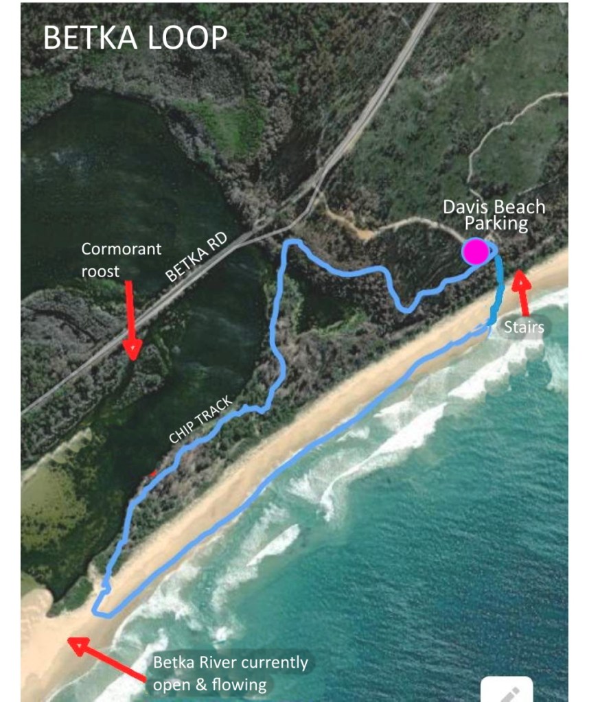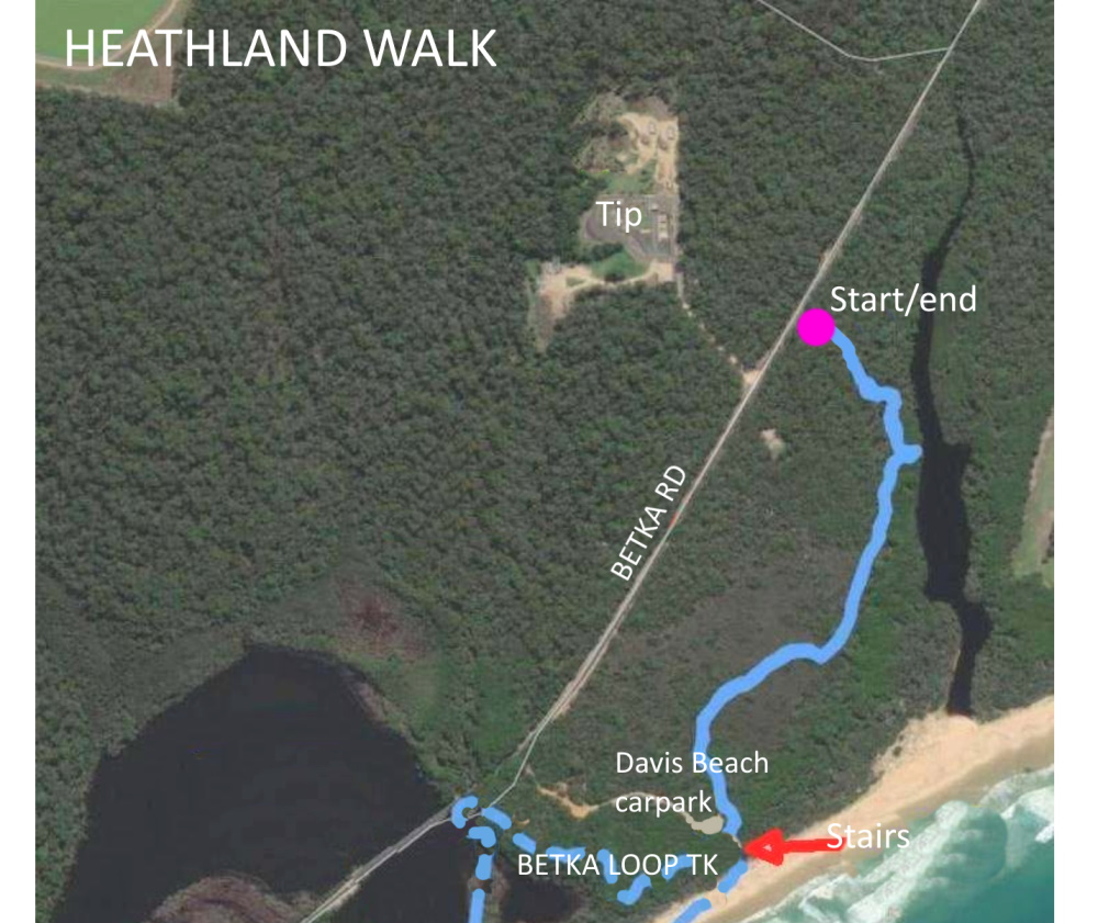eBird Hotspot: Heathland Walk. https://ebird.org/hotspot/L2552388 (When you get to Davis Beach car park could close and start second list as Betka River Mouth and Beach https://ebird.org/hotspot/L2552344.)Â