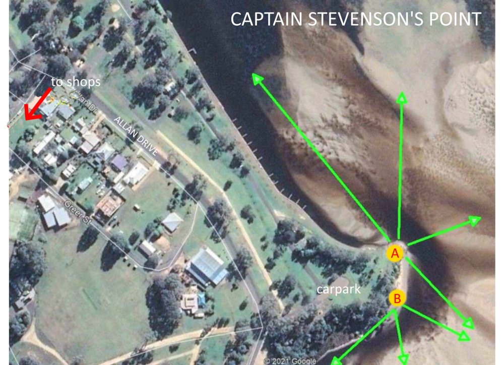 Accessibility: Walk from bitumen across smooth grass. Beware of steep drop to waterline! At Point B trees restrict view unless go down steps to water level