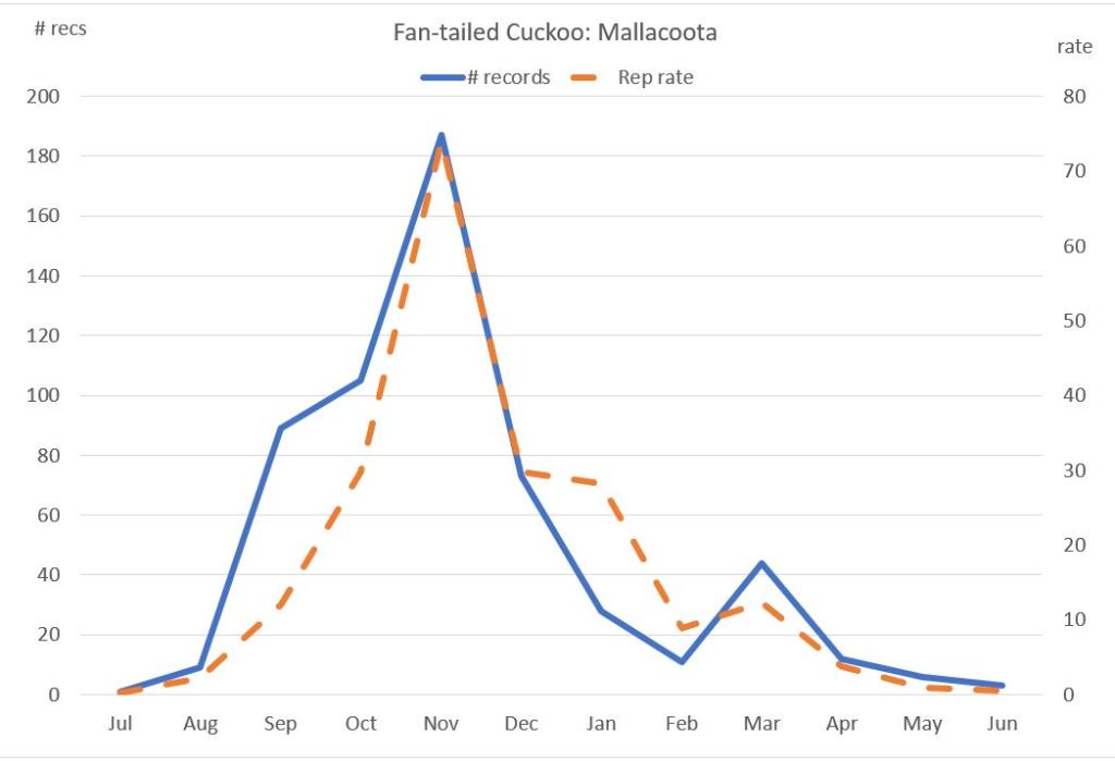 They are a bit migratory, but some stay in Mallacoota all year round. It’s difficult to know how much of the local population leaves the area, as many of the records over summer come from hearing calls. Calling mostly ceases in winter, making them harder to find. Martin Butterfield has put together these charts from eBird, showing far fewer sightings in June – July: